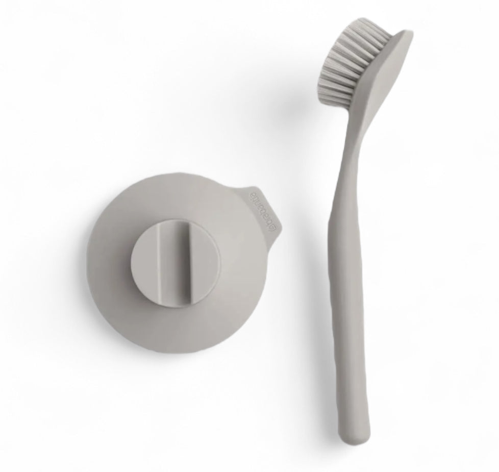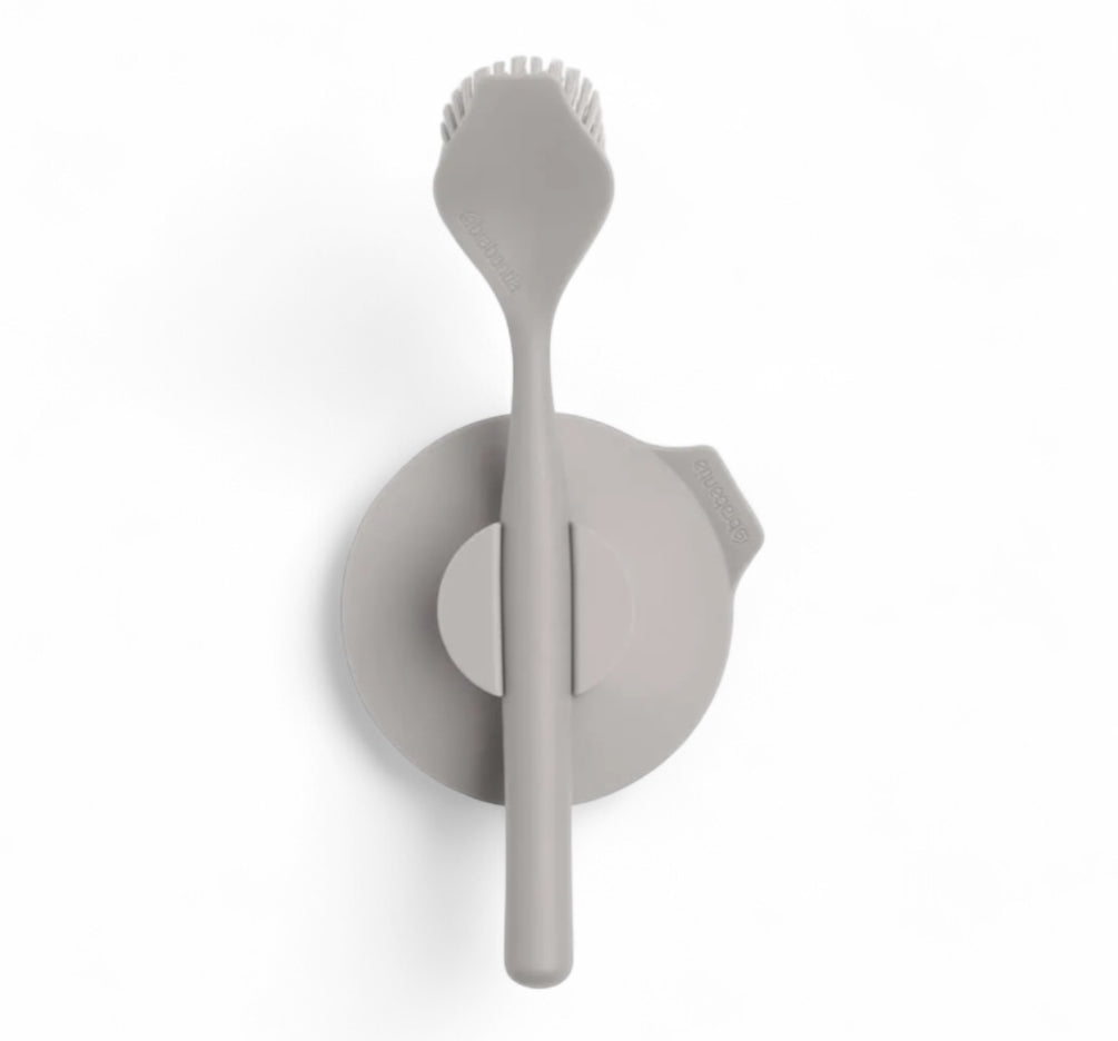Escova criada para lava louças, com suporte prático para você grudar na pia. A alça da escova é ergonômica, proporcionando uma aderência segura, mesmo quando molhada.