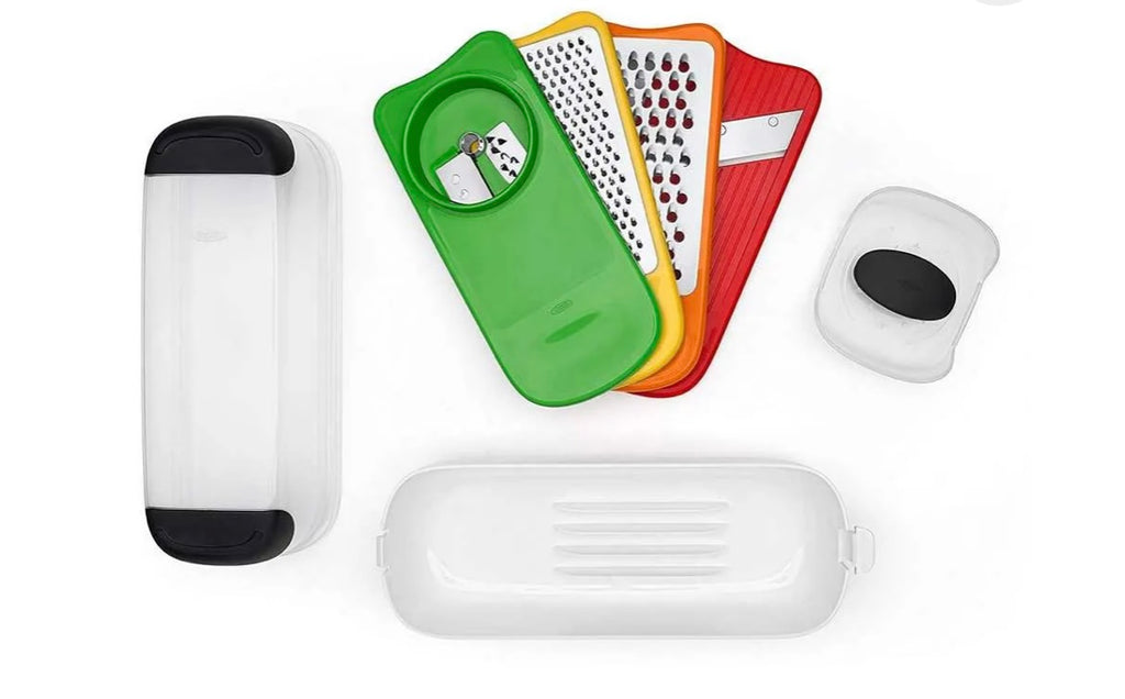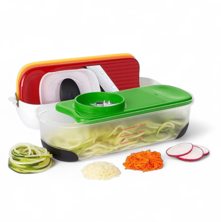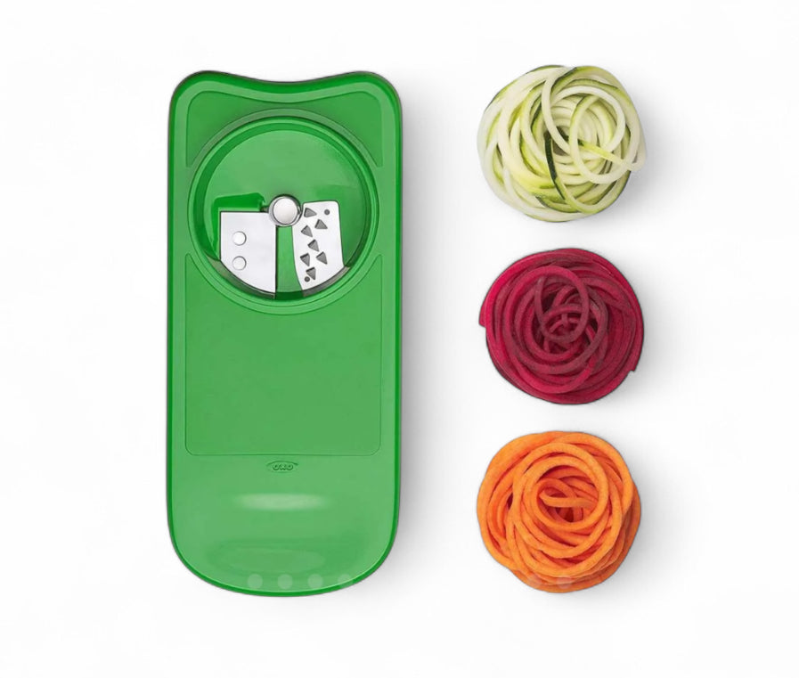 O ralador com espiralizador possui praticidade ao usar, guardar e armazenar. Todas as peças do produto cabem na base e são fáceis de colocar. Diversidade para ralar diversos legumes/verduras de acordo com o ralador que você escolher. Facilidade para ter uma comida mais saudável, sem muito esforço ou dificuldade para fazer a salada, contando ainda com a segurança para ralar com o segurador que mantém sua mão afastada da lâmina. Faça sua salada do jeito que preferir em poucos minutos! Ainda impressiona as visitas com a facilidade de ralar qualquer legume, verduras e até chocolate e queijo. Há mais de 25 anos atrás, depois de Sam Farber criar acessórios para facilitar a vida de sua esposa que sofria de artrite, foram criados os primeiros utensílios da OXO e desde então, a marca é referência de praticidade e inovação. Ficha técnica: