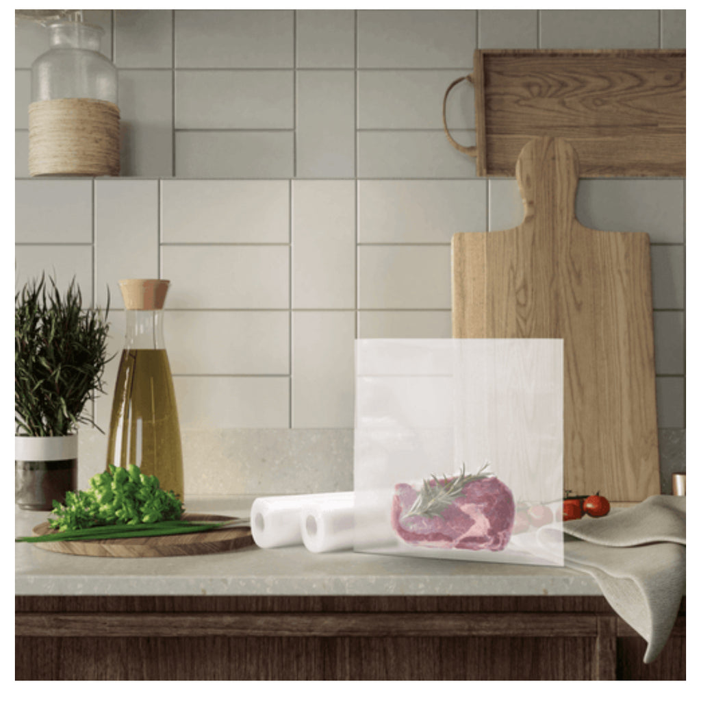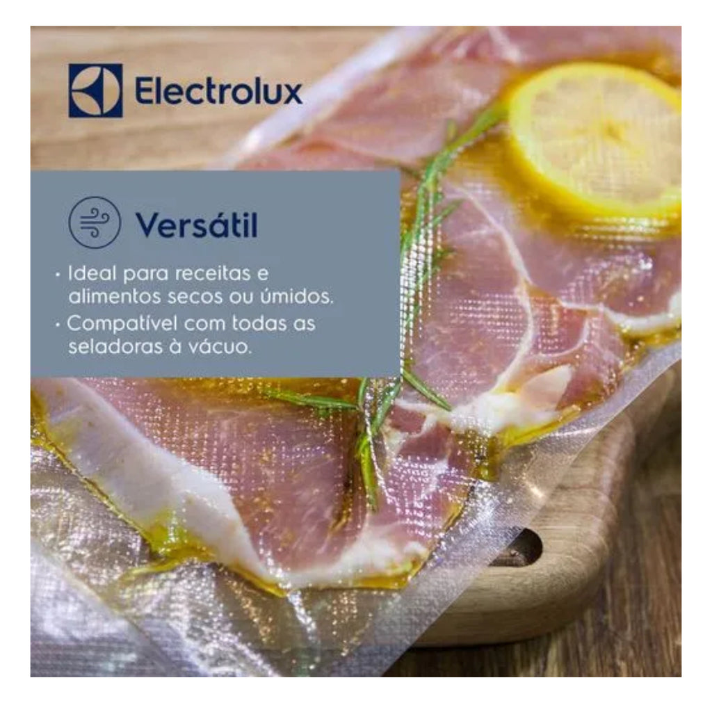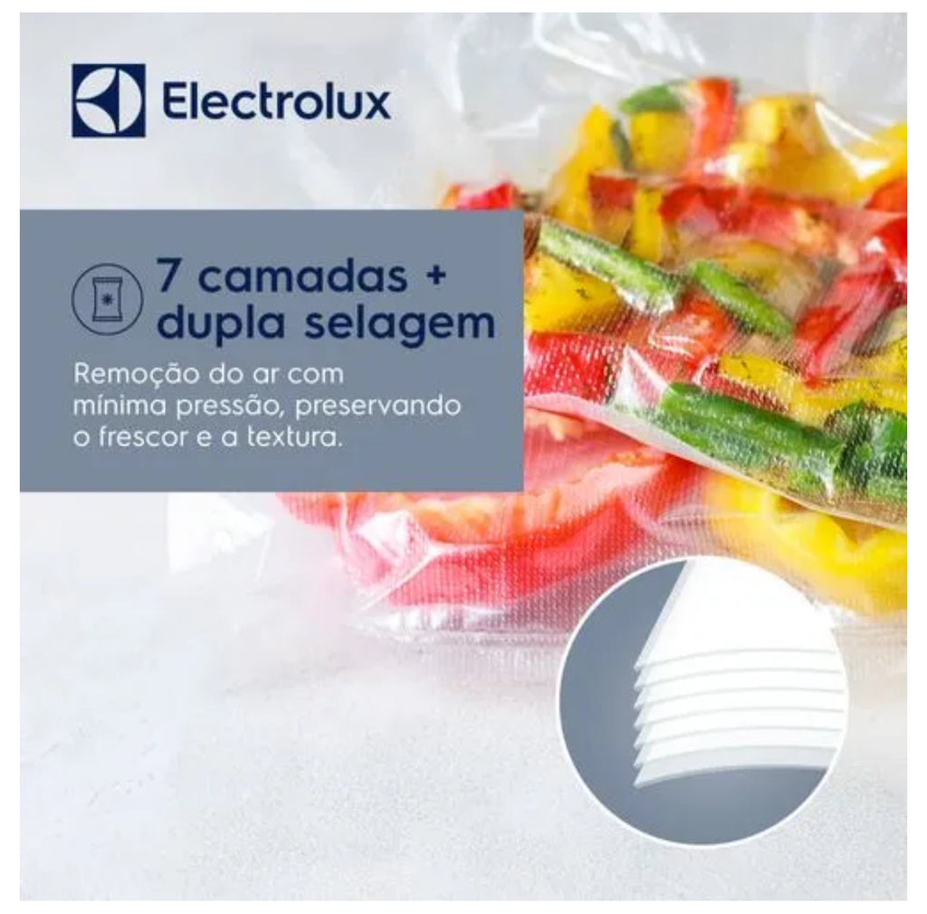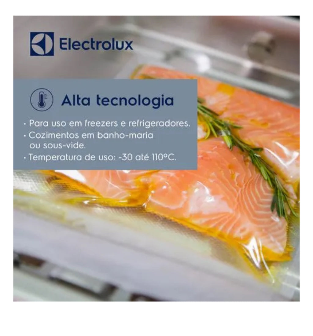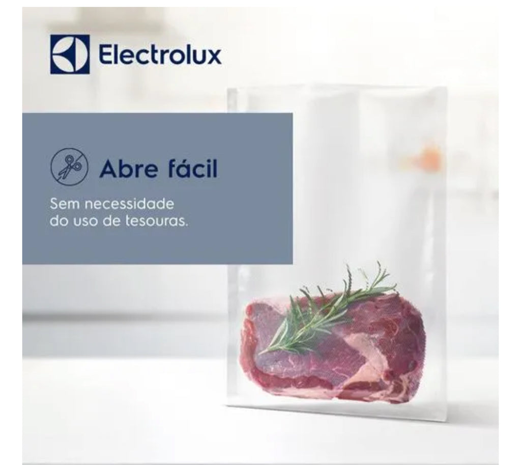 Sacos para Seladora a Vácuo Electrolux Portátil Branca. Pre-cortados e prontos para serem utilizados, os sacos para seladora proporcionam eficiência no fechamento a vácuo, mantendo os alimentos mais frescos e crocantes. Alimento Frescos e Crocantes Desenhado com 7 camadas e dupla selagem, removendo assim rapidamente o ar interior com a mínima compressão dos alimentos, bloqueando o oxigênio e umidade para manter um máximo frescor. Segurança Fabricado com materiais não tóxicos e seguros para uso em alimentos. Sem uso de cola química na sua fabricação. Livre de BPA e aprovado pela FDA. Multiuso Seguro para seu uso em freezer, refrigerador e preparo de alimentos em banho maria. Contém: 20 Saquinhos Pré-Cortados (22x30cm) Compatibilidade: Todas as seladoras a vácuo Temperatura de uso: -30°C até 110°C