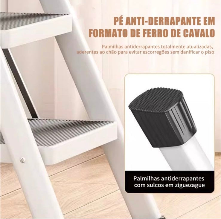 Com 176 cm de altura fechada e altura útil máxima de trabalho de 165 cm, você alcança com facilidade locais elevados sem precisar de equipamentos maiores e mais complexos. A altura útil do topo, de 125 cm do solo, garante conforto para realizar tarefas em balcões, prateleiras ou armários altos.Fácil de Limpar e Manter O revestimento antimanchas na cor branca premium não apenas oferece um visual moderno e limpo, mas também facilita a limpeza após o uso, resistindo à sujeira, água e produtos químicos leves. Além disso, o material é 100% reciclável, contribuindo para práticas sustentáveis no dia a dia.