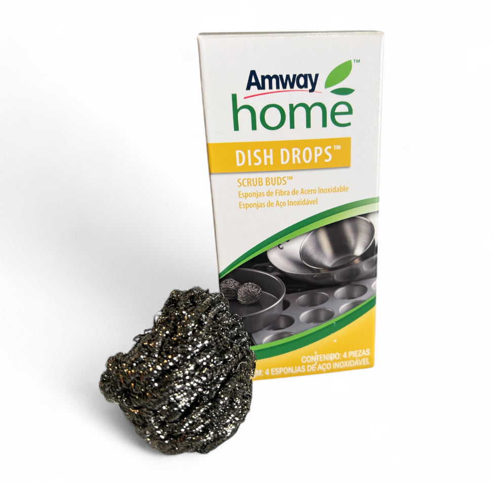 Dish Drops™ Scrub Buds é uma Esponja de Aço Inoxidável que ajuda a remover as sujeiras mais difíceis das louças. Diferente das esponjas comuns, não desmancha ou enferruja e tem toque suave para as mãos.